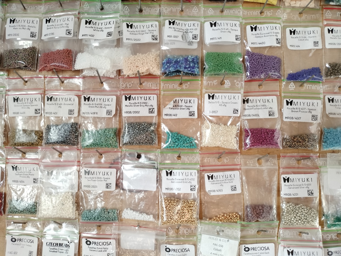 Les perles que j’utilise pour tous mes bijoux tissés sont des perles de rocaille de la marque japonaise MIYUKI.Ce sont des petites perles en verre qui ont la particularité d’avoir une forme très régulière. Elles sont parfaites pour le tissage de perles avec un métier à tisser, mais aussi sans métier à tisser grâce aux techniques de tissage Peyote et Brick Stitch.
