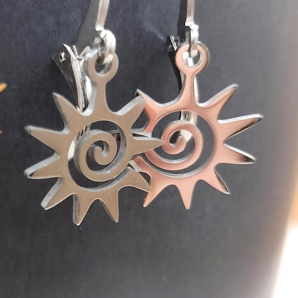 J’ai craqué pour ces petits soleils en forme de spirale qui me font penser au style ethnique. Je les trouve originaux et joyeux. Les pendentifs sont en acier inoxydable doré, or 18 carats pour la version dorée. Pour la version argentée l’acier n’est pas galvanisé, il est brut. Les Spirales soleils font 15 mm de long et 13 mm de large. Christophe les a montés sur des dormeuses créoles en acier inoxydable de 12 mm de diamètre. Les boucles d’oreilles, une fois mises, font 2,7 mm de long au total. Ces petits soleils spiraux ethno-chic sauront s’accorder à l’ensemble de votre garde-robe en toute saison. De plus, les boucles d’oreilles apporteront une touche d’originalité à votre style. Vous pouvez les assortir avec des bracelets en acier inoxydable et des colliers que vous trouverez dans la catégorie : « Les Incontournables » sur ce site.