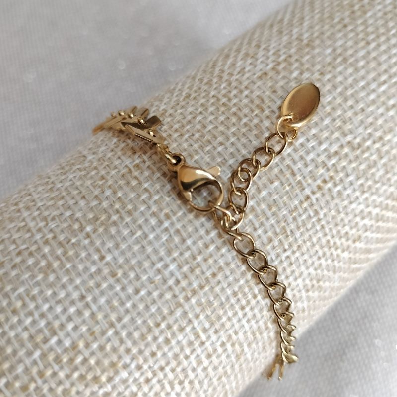 Ce bracelet, nous le fabriquons depuis nos débuts, il est désormais un des produits phare de la catégorie des « Incontournables » qui constitue la collection de bijoux artisanaux créés par l’équipe de Perle Fil Ciseaux. Il est réalisé en acier inoxydable doré, sa maille, dite « en chevron » est plate et large de 6 mm. Les chevrons qui composent cette chaîne donneront sur votre poignet une touche de modernité à votre style, de plus, le bracelet s’accordera en toute simplicité, à l’ensemble votre garde-robe. Celui-ci dispose d’une chaînette d’extension d’une longueur de 5 cm, elle aussi en acier inoxydable doré. Elle permet d’ajuster le bracelet à toutes les tailles de poignet. En effet, le bracelet peut aller sur un poignet qui fait 19 cm de circonférence maximum. Le fermoir mousqueton fixé à la chaîne du bracelet fait 1 cm, il est également en acier inoxydable doré. L’acier inoxydable ne rouille pas, ne noircit pas, il ne craint ni l’eau ni les cosmétiques, quant à l’entretien, rien de plus simple : un passage avec un chiffon à lunettes sur la chaîne de temps à autre pour lui redonner éclat et brillance, et c’est tout !