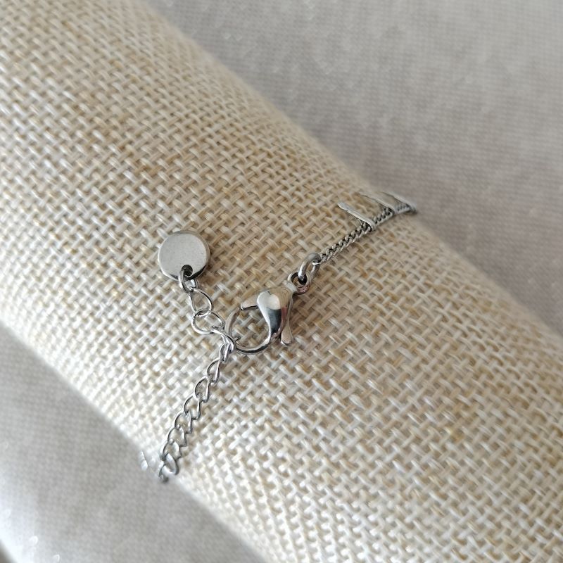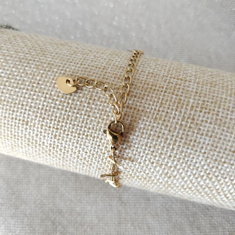 Ce bracelet, nous le fabriquons depuis nos débuts, il est désormais un des produits phare de la catégorie des « Incontournables » qui constitue la collection de bijoux artisanaux créés par l’équipe de Perle Fil Ciseaux. Il est réalisé en acier inoxydable sans galvanisation, c’est-à-dire brut ou doré avec de l’or 18 carats. La chaîne appelée maille « Gourmette » est parsemée à intervalles réguliers de petites barres ciselées de 6.5 mm. Cette chaîne fantaisie toute en finesse, donnera sur votre poignet une touche d’élégance et de modernité à votre style, de plus, le bracelet s’accordera en toute simplicité, à l’ensemble votre garde-robe. Celui-ci dispose d’une chaînette d’extension d’une longueur de 5 cm, elle aussi en acier inoxydable argenté ou doré. Elle permet d’ajuster le bracelet à toutes les tailles de poignet. En effet, le bracelet peut aller sur un poignet qui fait 19,5 cm de circonférence maximum. Le fermoir mousqueton fixé à la chaîne du bracelet fait de 1 cm à 1,2 cm, il est également en acier inoxydable argenté ou doré. La forme de la breloque ou bout de la chaînette d’extension peut varier, elle peut être un éventail, un rond ou encore un ovale. L’acier inoxydable ne rouille pas, ne noircit pas, il ne craint ni l’eau ni les cosmétiques, quant à l’entretien, rien de plus simple : un passage avec un chiffon en microfibre, (un chiffon à lunettes par exemple), sur la chaîne de temps à autre pour lui redonner éclat et brillance, et c’est tout !