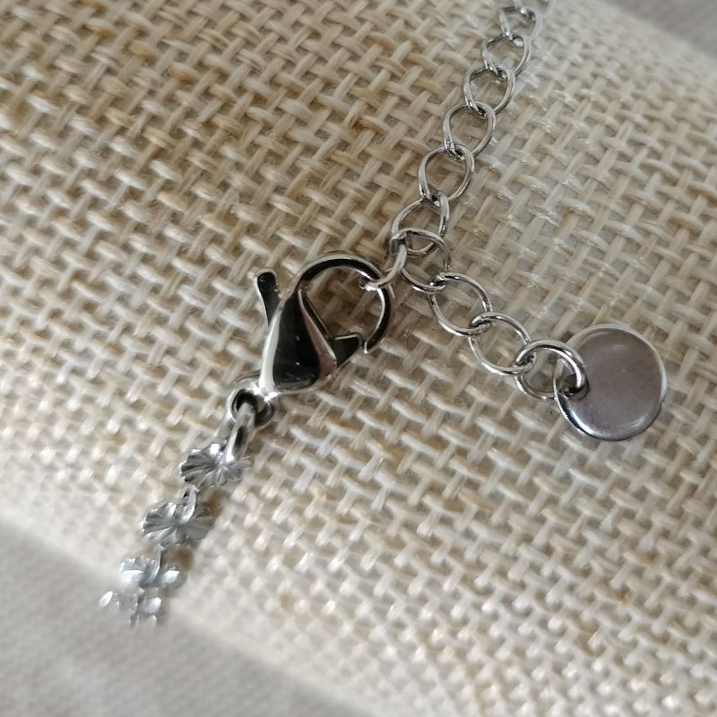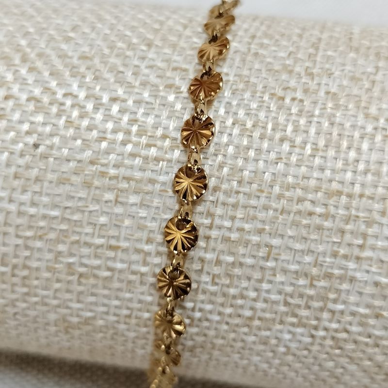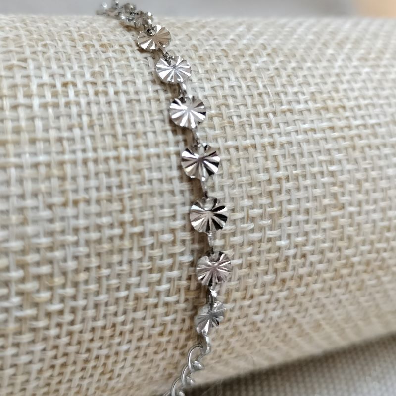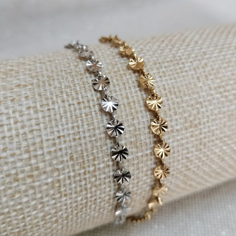 Ce bracelet, nous le fabriquons depuis le printemps 2024 seulement, largement plébiscité par notre clientèle, il est désormais un des produits phare de la catégorie « Les Incontournables » qui constitue la collection de bijoux artisanaux créée et fabriquée par l’équipe de Perle Fil Ciseaux. Il est réalisé en acier inoxydable doré avec de l’or 18 carats ou argenté (brut). Les mailles constituées de petites pastilles ciselées donnent un aspect lumineux à la chaîne. Gaie et élégante, elle saura s’accorder avec simplicité à l’ensemble de votre garde-robe. Les pastilles font 4 mm de diamètre. Le bracelet dispose d’une chaînette d’extension d’une longueur de 5 cm, elle aussi en acier inoxydable doré ou argenté. Elle permet d’ajuster le bracelet qui peut aller sur un poignet qui fait 19,5 cm de circonférence maximum. Le fermoir mousqueton fixé à la chaîne du bracelet fait de 1 cm à 1,2 cm, il est également en acier inoxydable doré ou argenté. L’acier inoxydable ne rouille pas, ne noircit pas, il ne craint ni l’eau ni les cosmétiques, quant à l’entretien, rien de plus simple : un passage avec un chiffon en microfibre, (un chiffon à lunettes par exemple), sur la chaîne de temps à autre pour lui redonner éclat et brillance, et c’est tout !