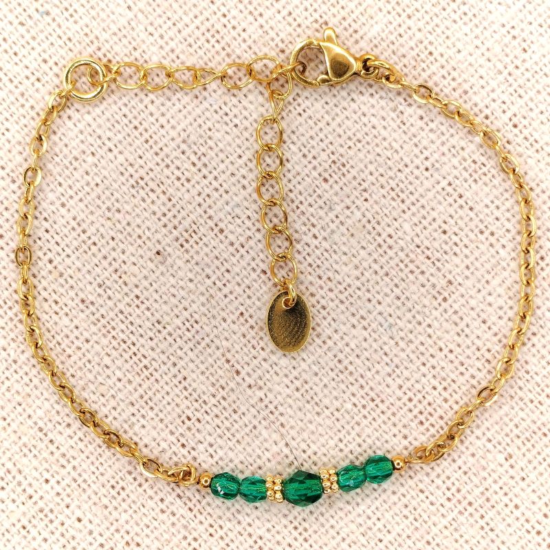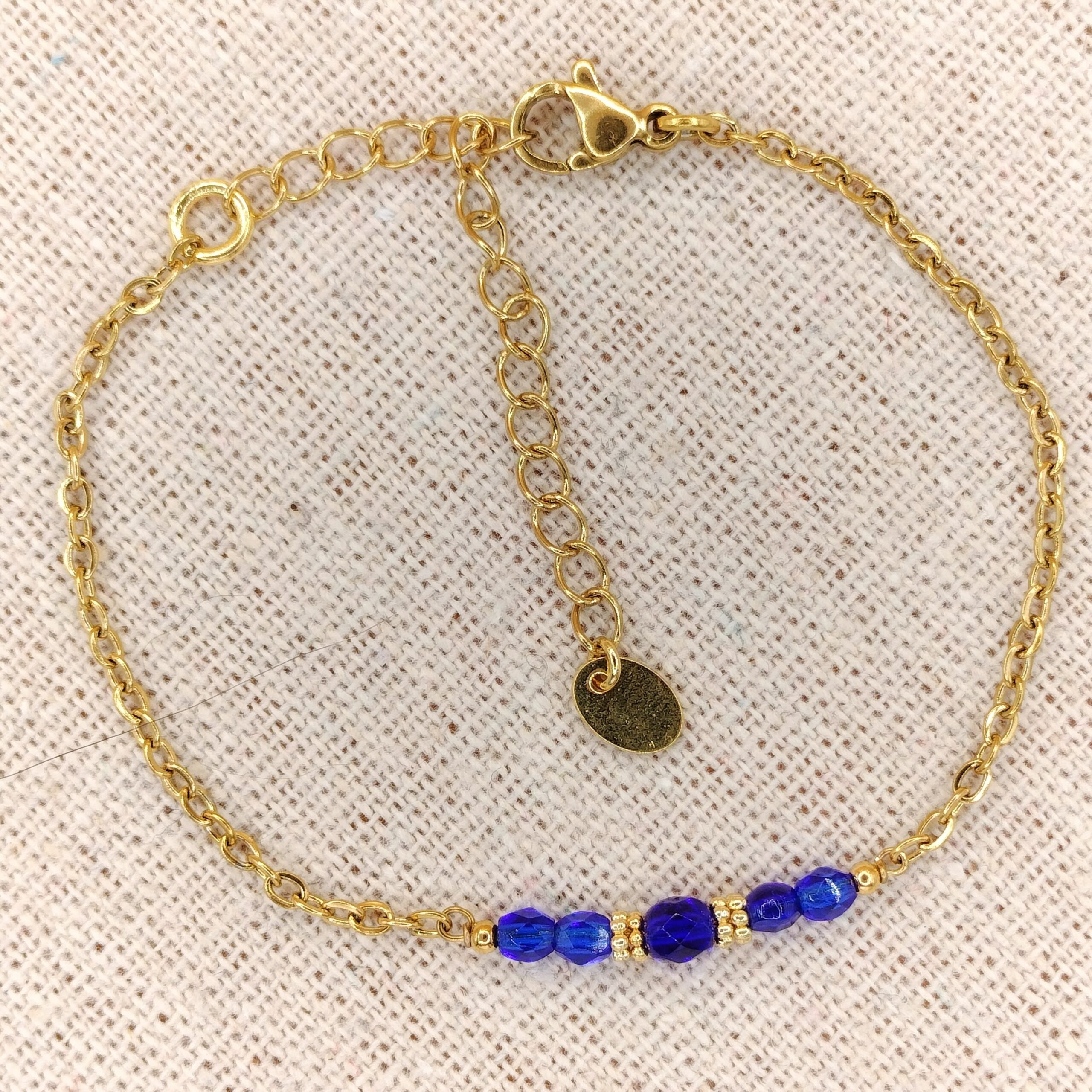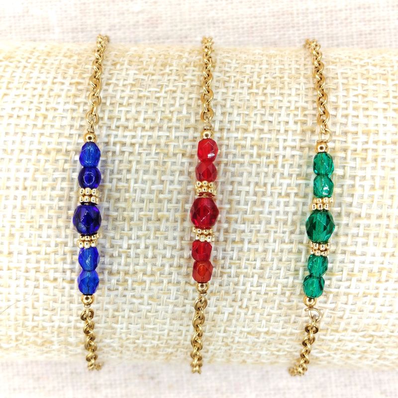 Le bracelet en perles de verre, fait au total 21 cm de long. Il est composé d’une chaîne en acier inoxydable doré à l’or 18 carats, avec en son centre, 5 perles en verre facettées. Les perles sont ovales, celle du milieu, fait 4 mm de long par 3 mm de large, Christophe l’a encadrée de deux fines rondelles travaillées en acier inoxydable. Les 4 autres perles font elles 3 mm sur 2 mm de large.
